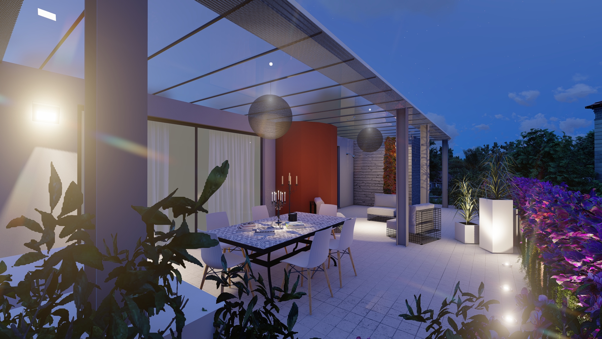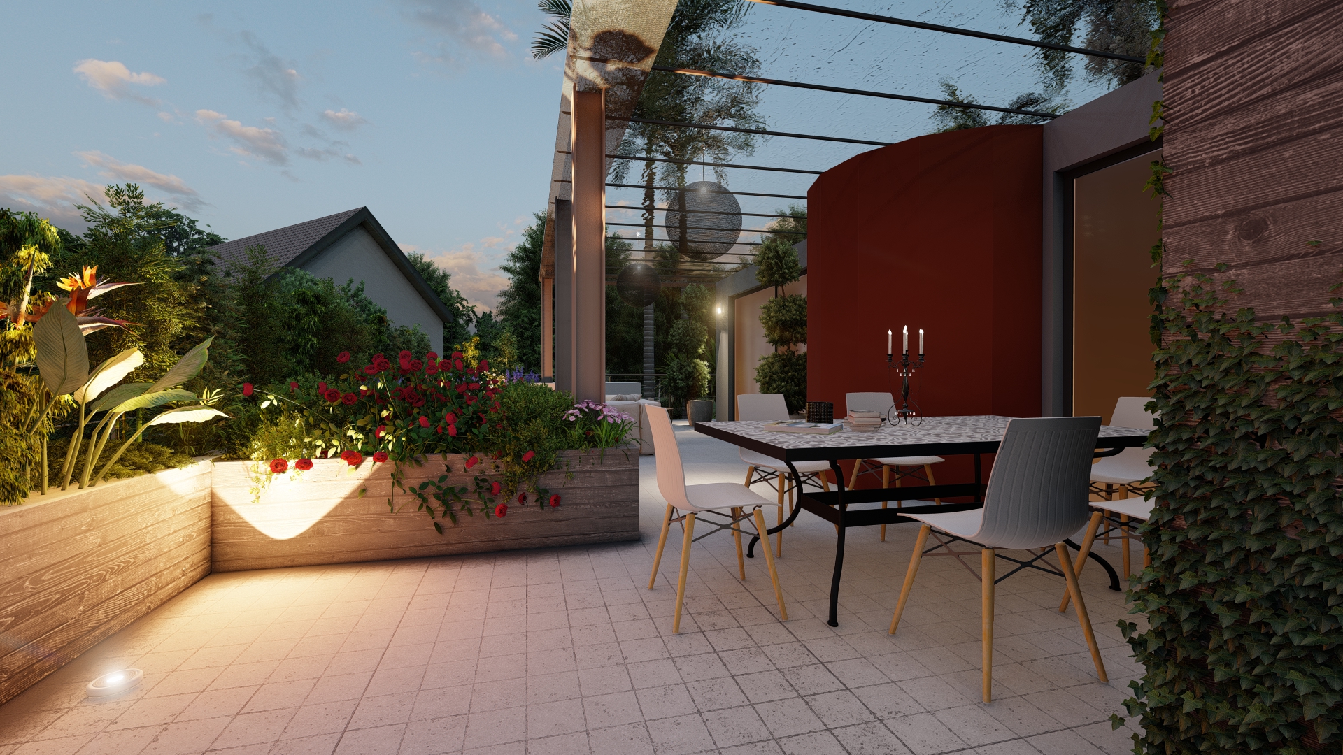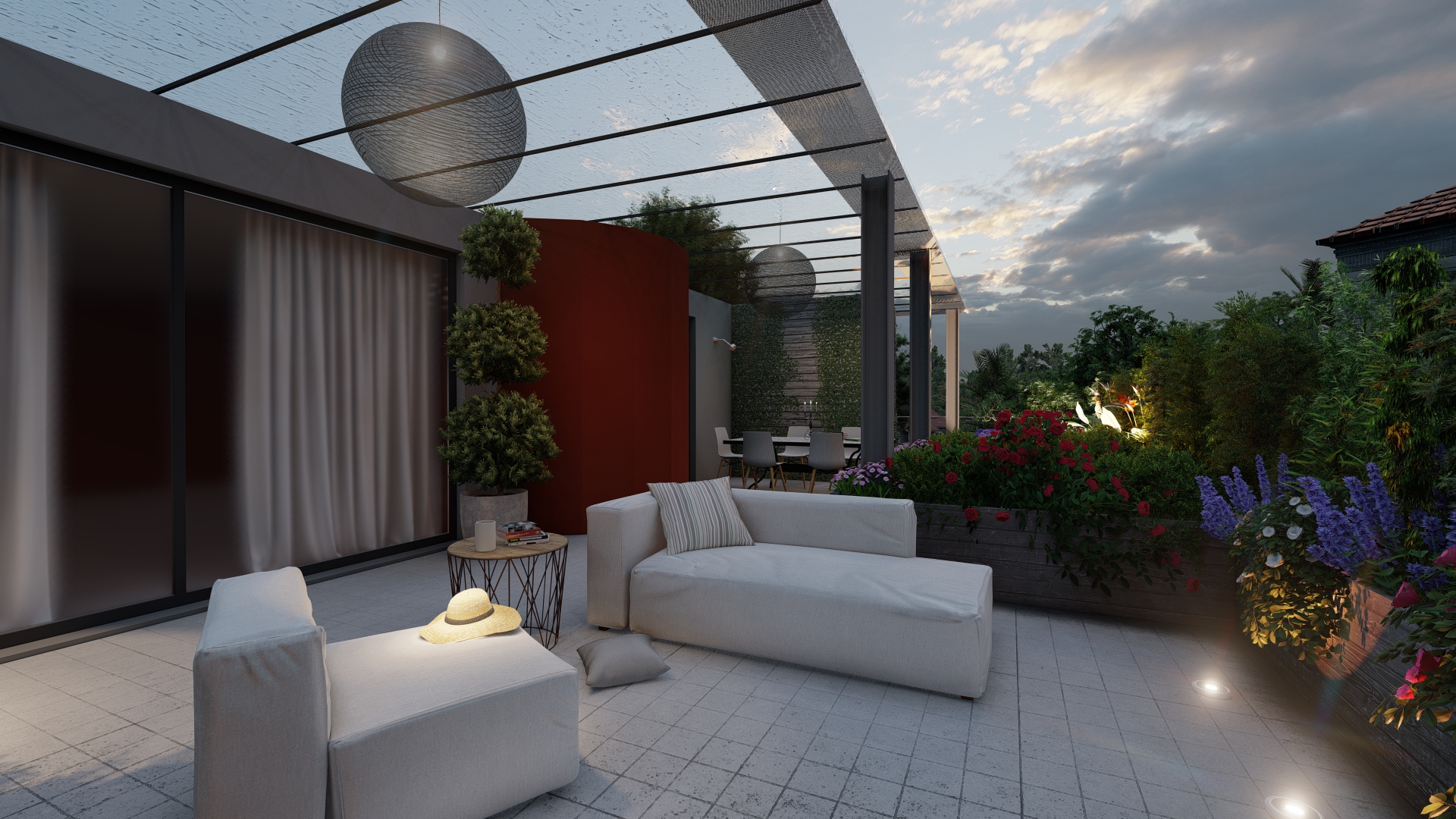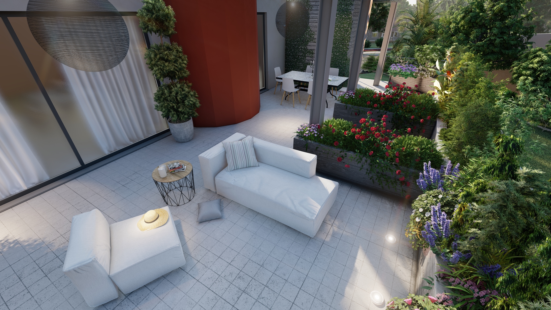 Il giardino è stato sviluppato ponendo attenzione alla scelta delle varietà da piantare e alla posizione della terrazza al fine di creare un riparo naturale dal vento, dalle intemperie e dagli sguardi invadenti.